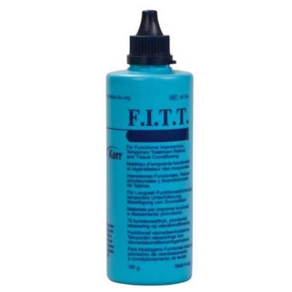 Fitt polvo. Acondicionador de tejido. La mejor aplicación del Fitt es su uso material de impresión de rebase. Como FITT actúa de manera fluida bajo cualquier condición produciendo una verdadera impresión funcional.