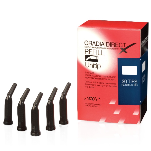 Gradia direct X unitip. Gracias a su increíble capacidad de adaptación al alrededor de la estructura del diente se pueden lograr fácilmente con sólo un color restauraciones de una sobresaliente estética. La combinación de los diferentes colores le ofrece resultados estéticos.