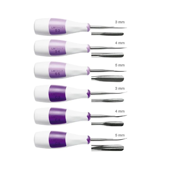 Luxador Slimlift LM. Son particularmente destinados a acceder a las áreas difíciles de alcanzar que no son accesibles por los instrumentos de luxación tradicionales. Permiten las extracciones de piezas dentales de la forma menos traumática posible. Esto es importante par una cicatrización rápida. La punta ultra fina del instrumento se introduce en el espacio periodontal y avanza lentamente hacia el ápice mientras se gira suavemente el instrumento hacia atrás y hacia adelante. No utilizar como palanca.