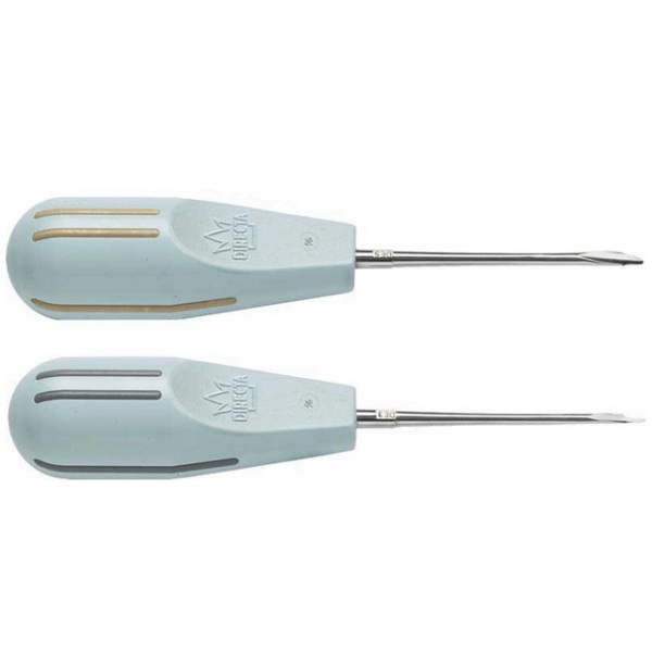 Luxator dual edge periotome. Especialmente diseñados para cortar ligamentos con una fina hoja que también comprime el alveolar, corta la membrana y facilita la extracción, produciendo el mínimo trauma posible. Integra la función de periostotomo y luxador en un solo instrumento. Ideal para piezas fracturadas y raíces cariadas.