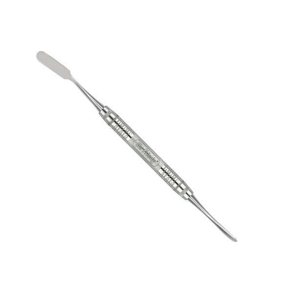 Periostotomo Prichard. Instrumento metálico alargado cuyos extremos o partes activas están aplanadas. Su parte central es cilíndrica y la que utiliza el odontólogo para poder coger el instrumento. Para retraer el mucoperiostio.