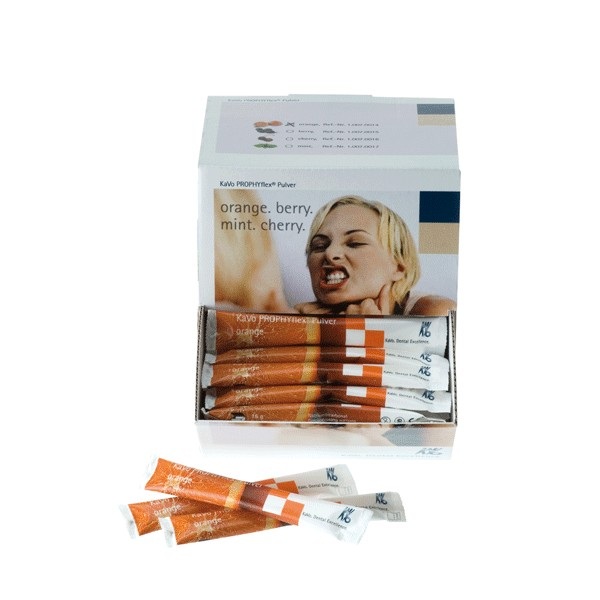 Prophyflex es un nuevo polvo de limpieza de carbonato de calcio. La gran diferencia de este polvo de limpieza es que no tiene cantos ni aristas ya que su forma es redonda: la potencia de limpieza se ve incrementada por estas partículas con un sinfín de puntos de contacto con el diente, a la vez que se evita la creación de grumos y daños al esmalte. Las Prophyflex eliminan rodando concreciones, placa y sarro, con gran exactitud y de manera suave y eficaz. El carbonato de calcio no tiene sabor y se presenta en tubos de 15 gramos cada uno. Prophyflex es válido para cualquier aparato de limpieza por bicarbonato. Sabor naranja. Grano de 60-70 micras.