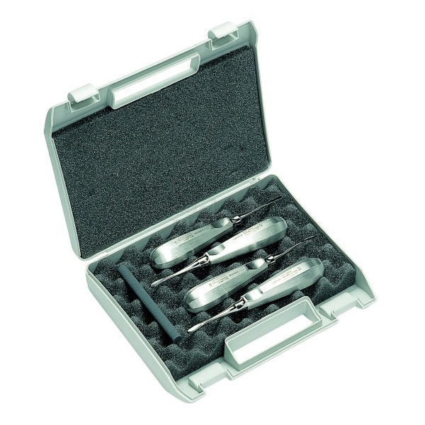 Set botadores 9588. Juego de Luxadores 9588 de Carl Martin para separar la encía del diente antes de la extracción del mismo. Los bordes del luxador son cortantes y de forma plana. La forma da un perfecto control. El kit incluye dos luxadores rectos, dos curvos y una piedra de afilado. Esterilizables en autoclave.