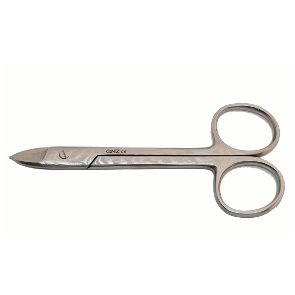 Tijera para coronas GNZ. Tijera metálica con gran capacidad de corte, están diseñadas y fabricadas especialmente para cortar metal. Material: Acero Inoxidable. Esterilizable en autoclave.