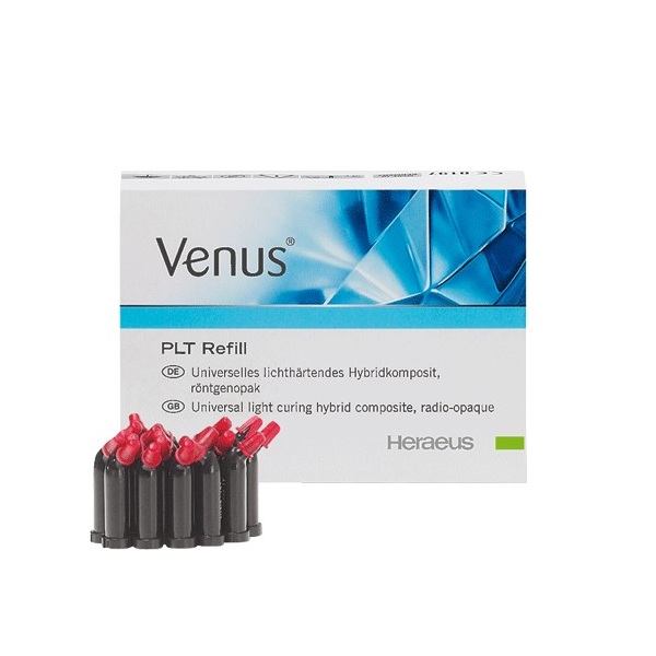 Venus PLT es un composite universal fotopolimerizable de base híbrida con partículas finísimas. Resulta ideal para elaborar de forma rápida, sencilla y fiable restauraciones altamente estéticas en dientes anteriores y posteriores. Su gama cromática abarca 27 colores. Además de los colores estándar adaptados a la guía de colores VITA® también están disponibles colores especiales y tonos muy claros (Super Bleach) para el tratamiento de dientes blanqueados. Una guía de colores de 2 capas fabricada con material original facilita enormemente la selección del color adecuado.